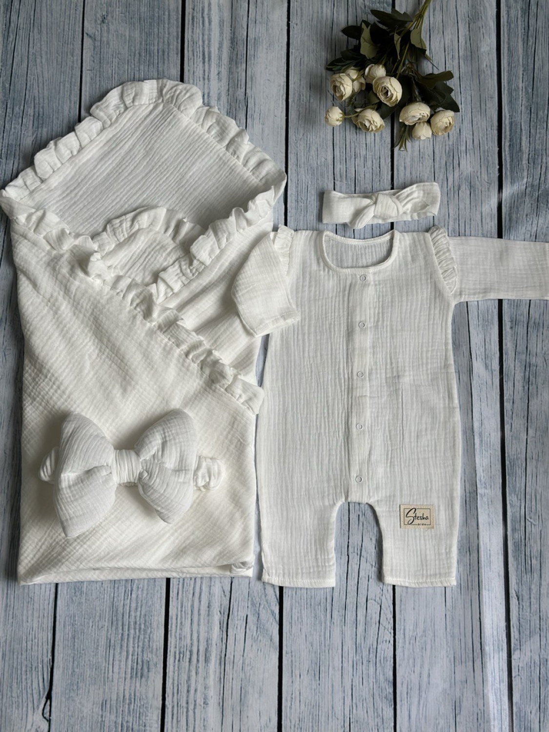Теги: Купить детские конверты, комбинезон оптом, детские конверты на выписку оптом. 335-М. Комплект из детского комбинезона, р 56 и конверта муслин, хлопок 100% 90/90 см, молочный цена,отзывы официальный сайт "Стеша Пермь"